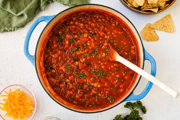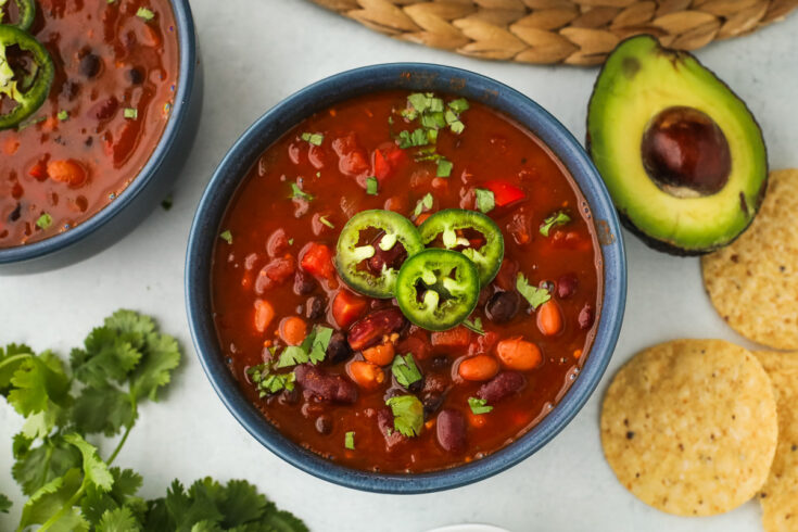This 3 bean vegetarian chili is made with a combination of black beans, pinto beans, and kidney beans. It has 25g of protein and 16 grams of fiber for a deliciously satisfying plant-based meal!