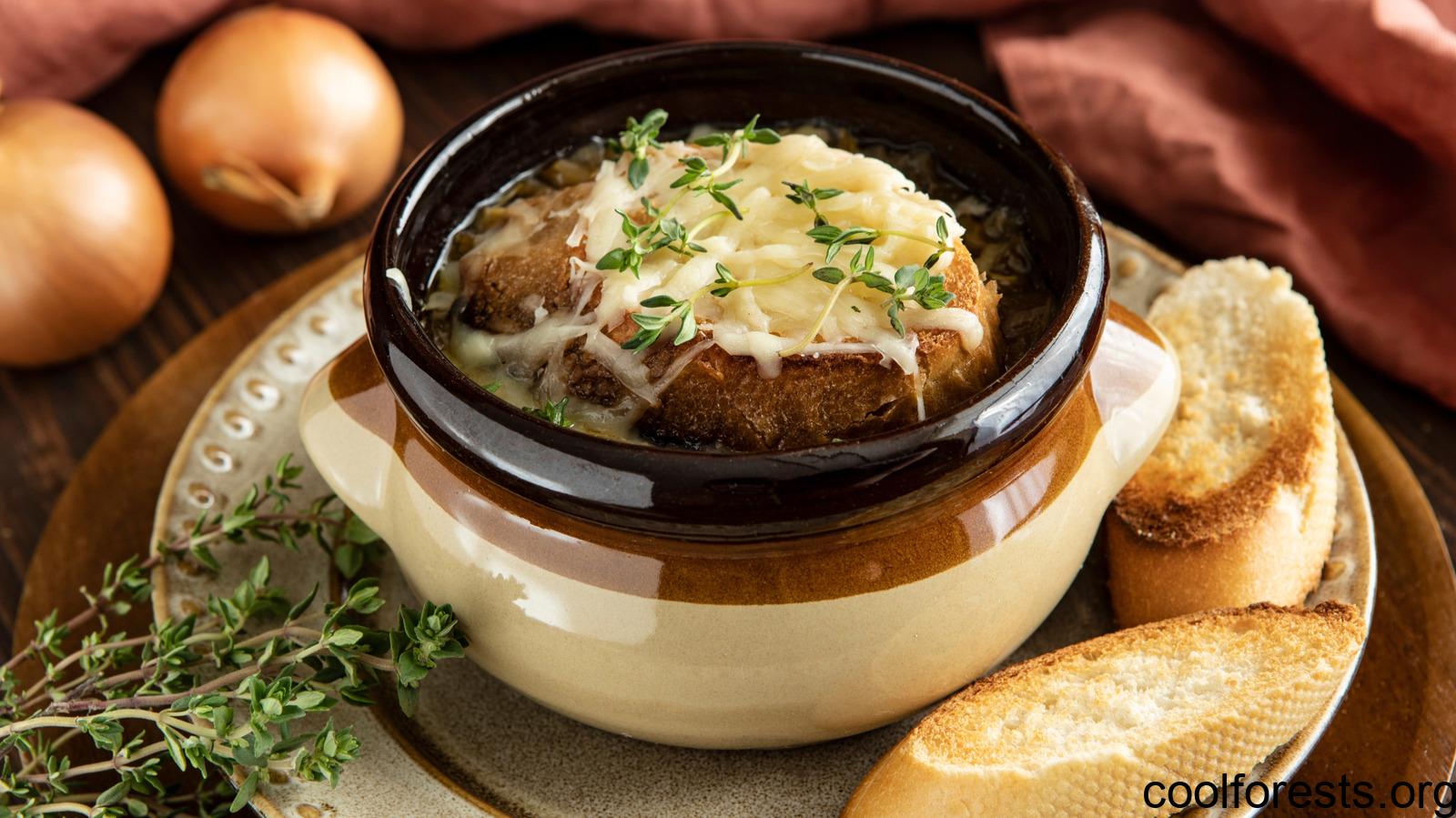 You’ll need to use oven-safe bowls or crocks and spoon the soup into them. If you prefer, you can pre-toast the slices of baguette as well before topping them with cheese for a crispier spoonful. The preferred method for this final stage is to blanket the bread with cheese on the soup, set it on your oven’s middle rack, and broil it on high until lightly browned and crusty.
