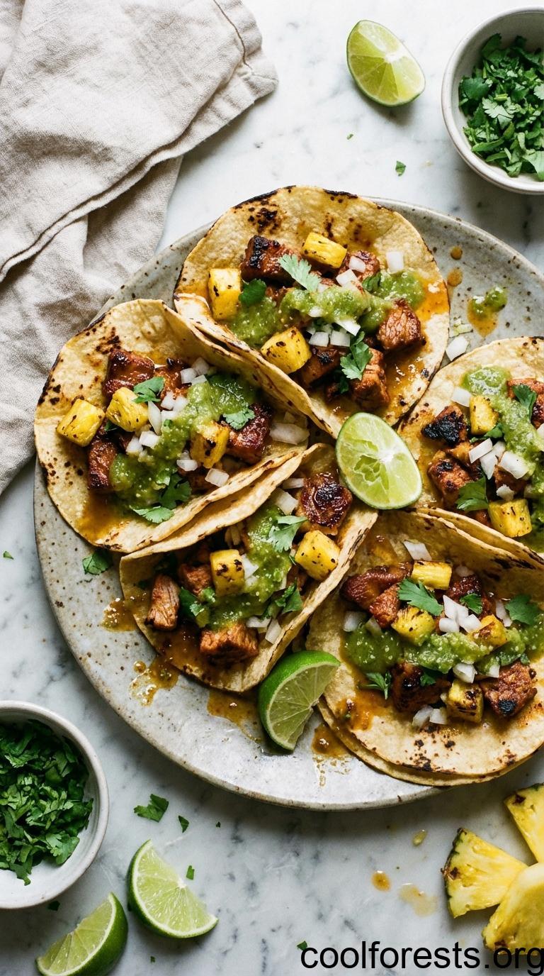 Serve on doubled-up corn tortillas topped with the diced charred pineapple, white onion, fresh cilantro, a squeeze of lime, and salsa verde. Doubling the tortillas is non-negotiable. A single tortilla will tear under the weight of the meat, and the two layers give you a sturdier vehicle for all those toppings.