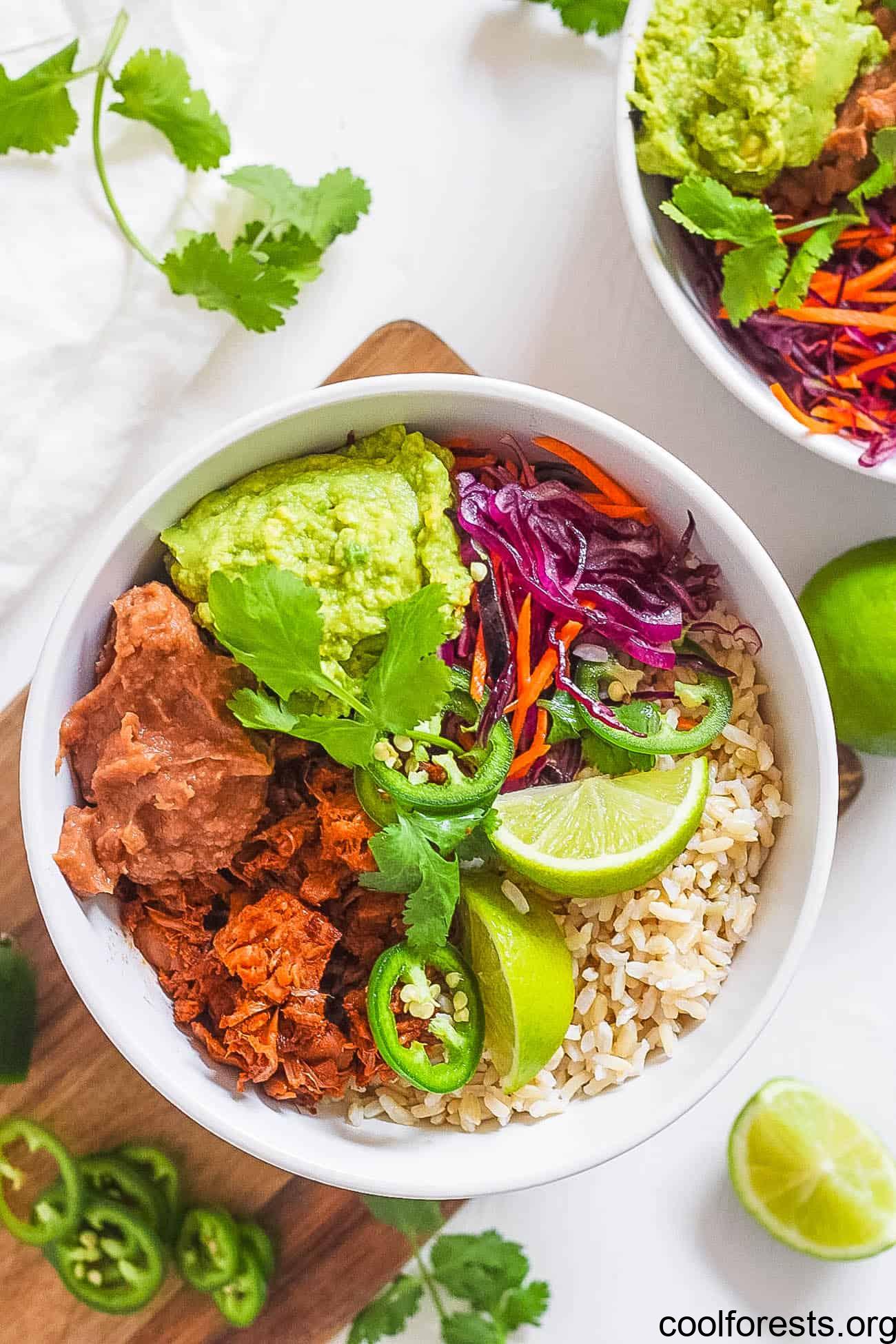 This BBQ jackfruit burrito bowl works really well on a bed of my 4-ingredient cilantro lime rice. And instead of the usual toppings, I highly recommend topping the jackfruit with a hearty helping of my Mexican coleslaw, for southern-inspired fusion.