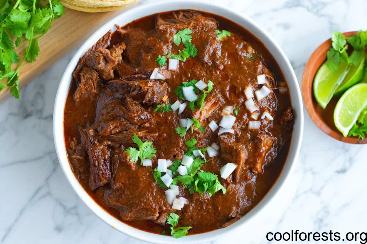 To serve this as a stew: Skim some of the fat from the top of the pot (there will be a lot), then pull the beef into large, spoon-sized chunks. Spoon the beef into a bowl with a generous amount of the consomé, then top with chopped raw onion, cilantro, and a good squeeze of lime juice. Serve with a side of rice or warm tortillas (here’s our recipes for flour tortillas or corn tortillas).