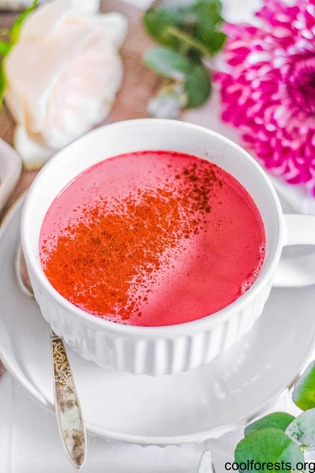 Pour Vegan Beet Latte: I carefully pour the hot latte into 2 large mugs and top each with a sprinkle of cinnamon.