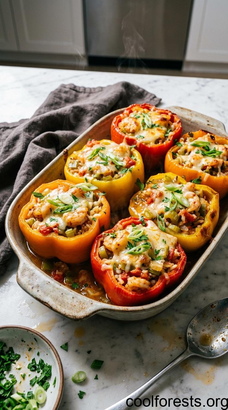The Louisiana version of stuffed peppers swaps the Italian seasoning for Cajun spices and replaces ground beef with a shrimp-and-rice filling that is lighter but every bit as satisfying. The trinity — onion, celery, bell pepper — shows up inside the bell pepper, which is a very Louisiana move. The cheese on top melts into a bubbling crust that makes the whole thing irresistible.