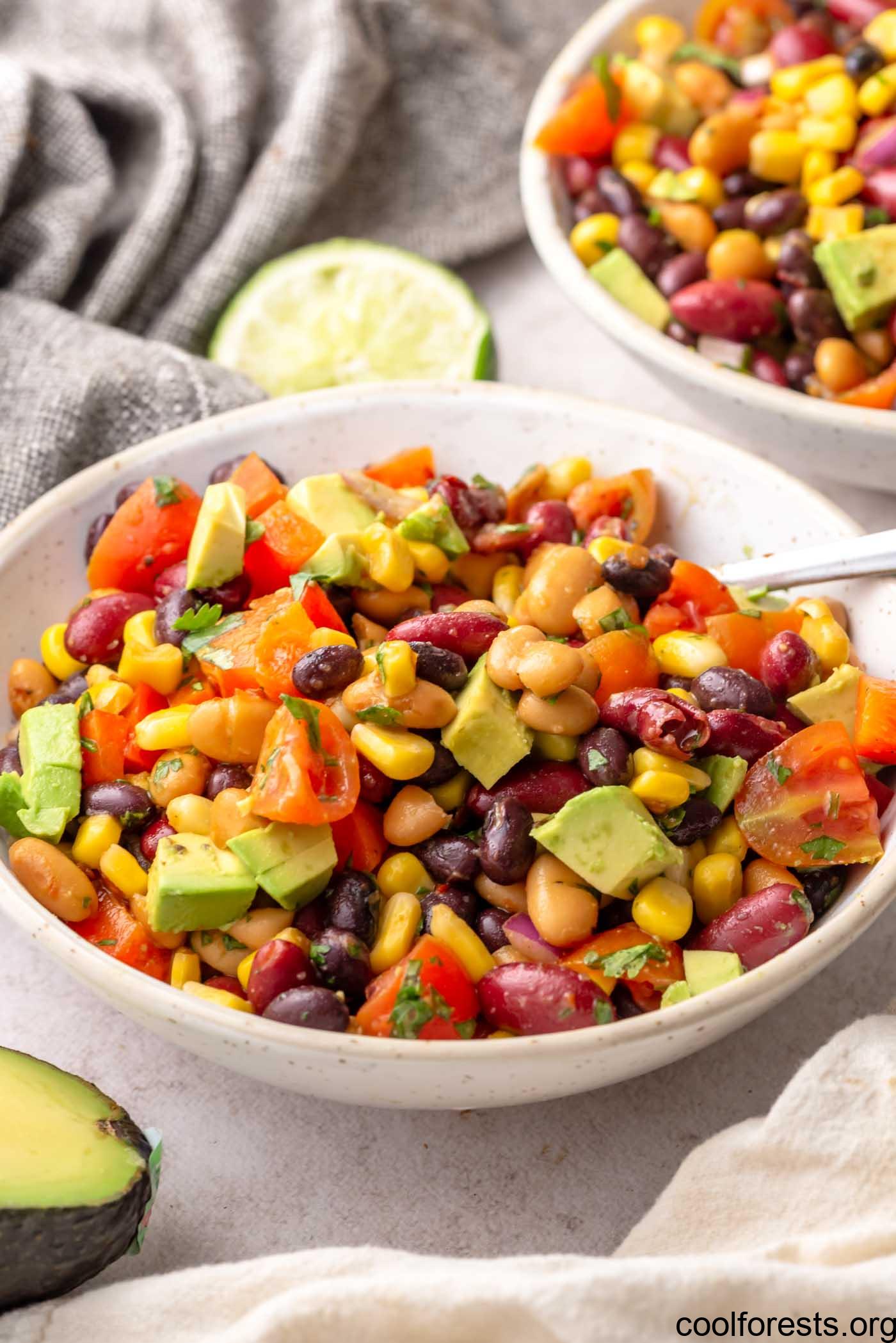It’s packed with three kinds of beans, corn, and a smoky cilantro dressing that brings everything together. It’s bold, balanced, high in fibre and protein, and quick and easy to make in 20 minutes. It also tastes even better the next day so it’s great for meal prep!