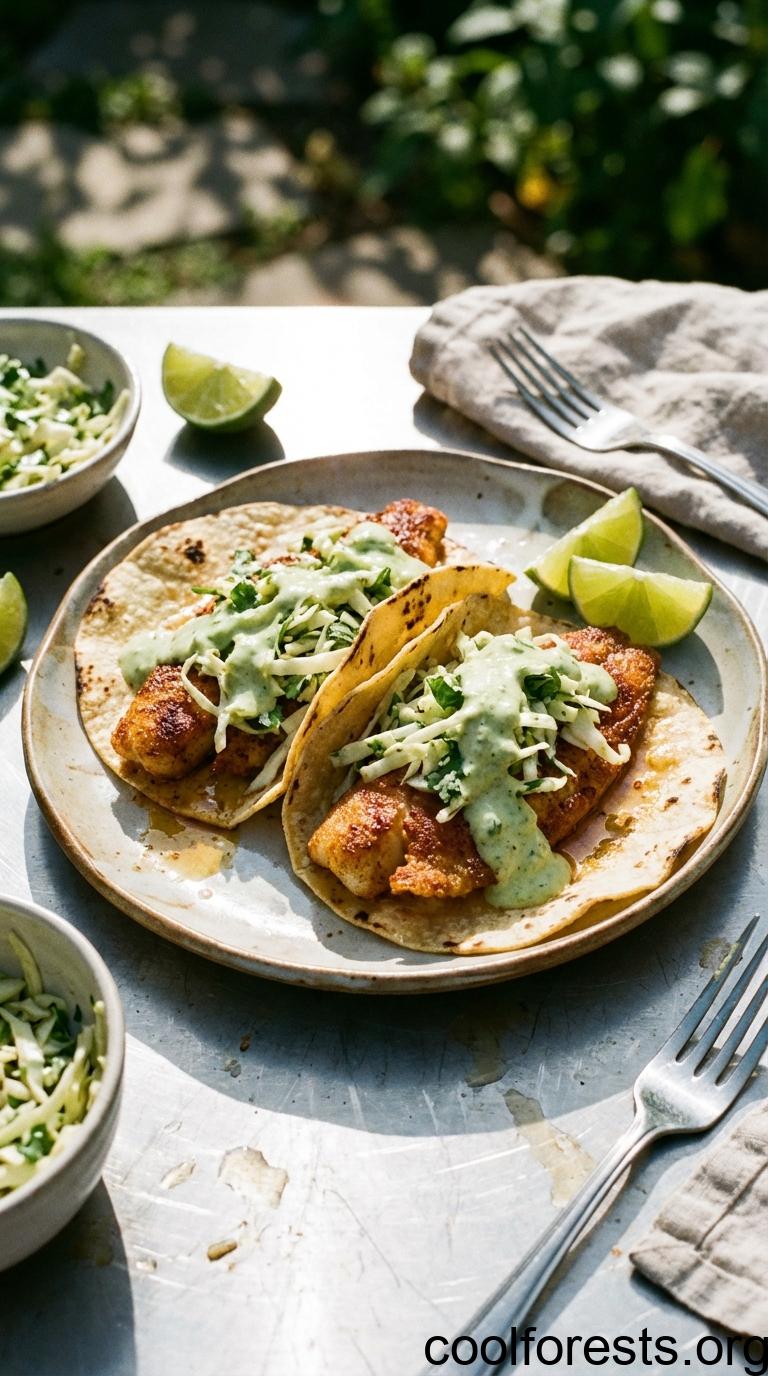 - Assemble the tacos by placing a piece of fish on each tortilla, topping with slaw, and drizzling with avocado sauce.