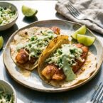 Crispy Fish Tacos with Avocado Sauce and Cilantro Slaw