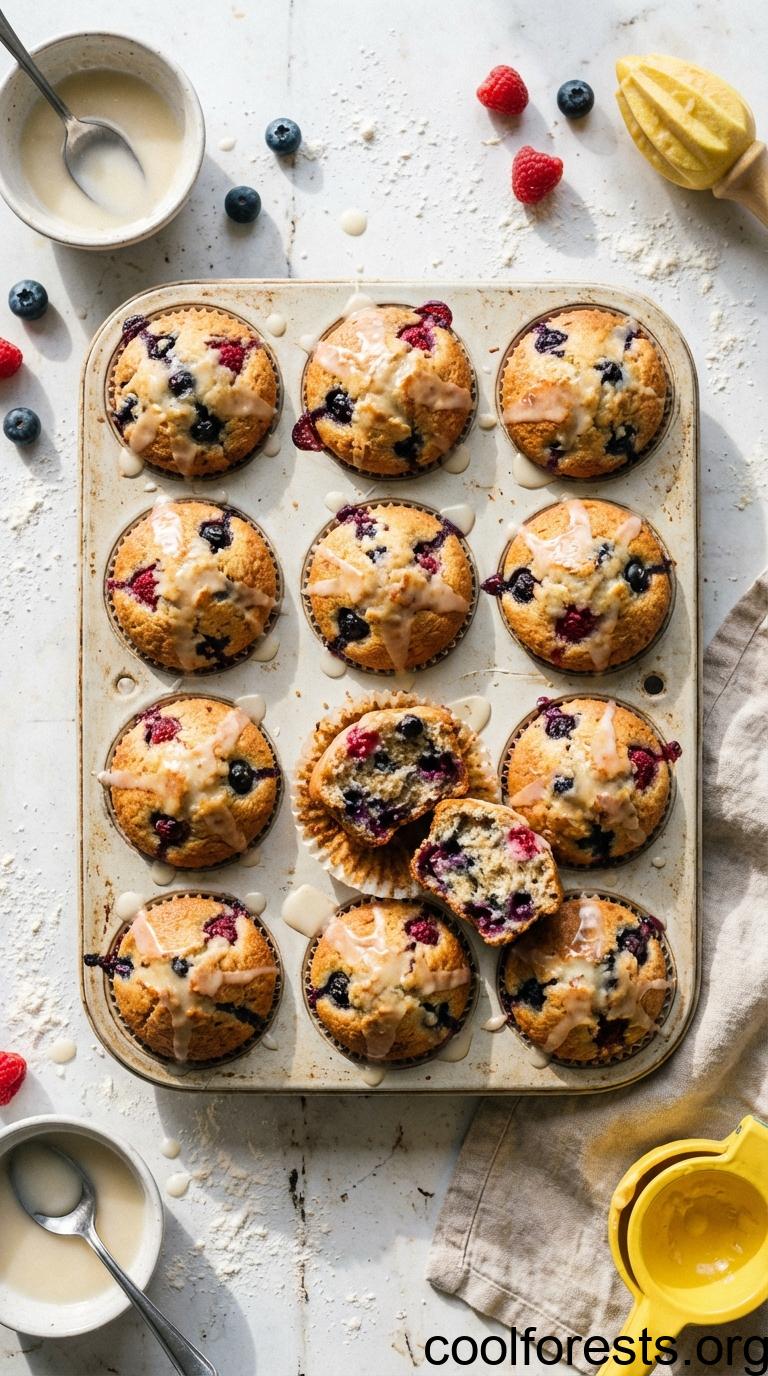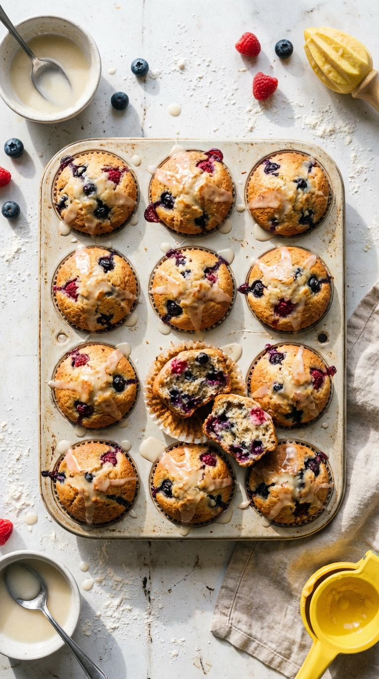 The blueberries hold their shape and burst with juice when you bite into a warm muffin. The raspberries break apart slightly during baking and stain the surrounding crumb pink. Together, they create a muffin that has more going on in every bite than a single-berry version. The lemon glaze on top is sharp enough to cut through the sweetness.