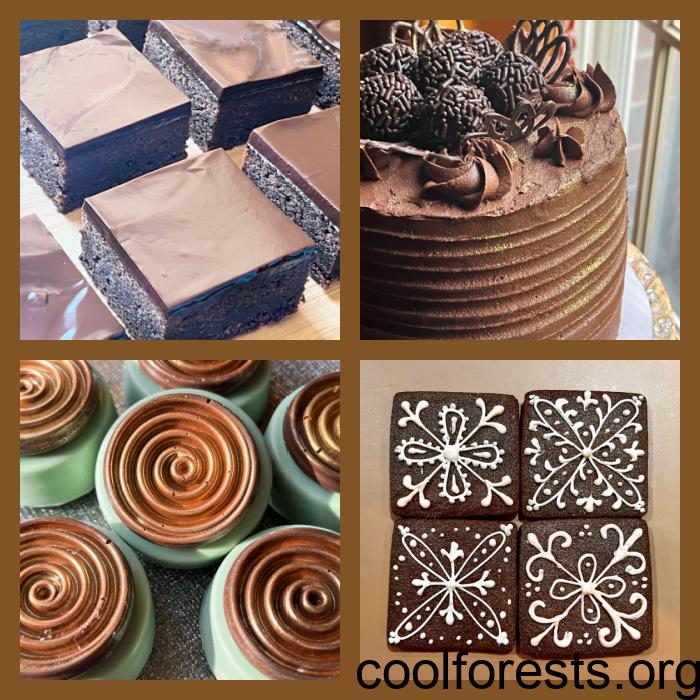 These turned out so cool, I was super happy with them. My sister Norma pointed out they reminded her of Leonardo da Vinci’s inventions, so that’s the reason for the name. I used a silicone mold I’ve had for many years to make the decorations with dark compound chocolate, later brushed with luster powder copper. I used a very light green to tint the chocolate for the molds.