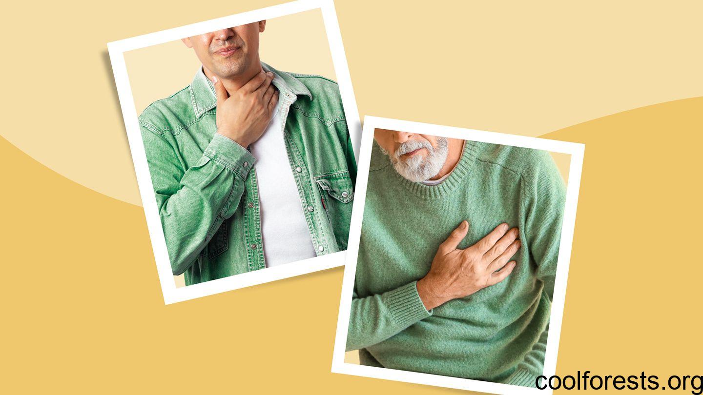Symptoms GERD Symptoms GERD may cause a number of different signs and symptoms, not all of which may be present in any particular case. Common symptoms include: Frequent heartburn , a burning feeling in your chest or throat Regurgitating food or stomach contents Sore throat Difficulty swallowing (dysphagia) Feeling like there’s a lump in your throat Damaged teeth from stomach acid Chest pain Bad breath Nausea Vomiting ( 2 , 3 ) Certain symptoms may also come from respiratory complications of GERD, which happen when you breathe stomach acid into your lungs. These symptoms can include: Asthma, a chronic disease characterized by sensitivity to lung irritants Chest congestion A dry cough that doesn’t go away Wheezing, or constricted breathing that causes a high-pitched sound Hoarseness or partial loss of your voice Laryngitis , or swelling of your voice box, which can cause temporary loss of your voice Pneumonia, or lung infection (3) If you have acid reflux at night, you may experience disrupted sleep or be at higher risk for respiratory complications of GERD. (2)