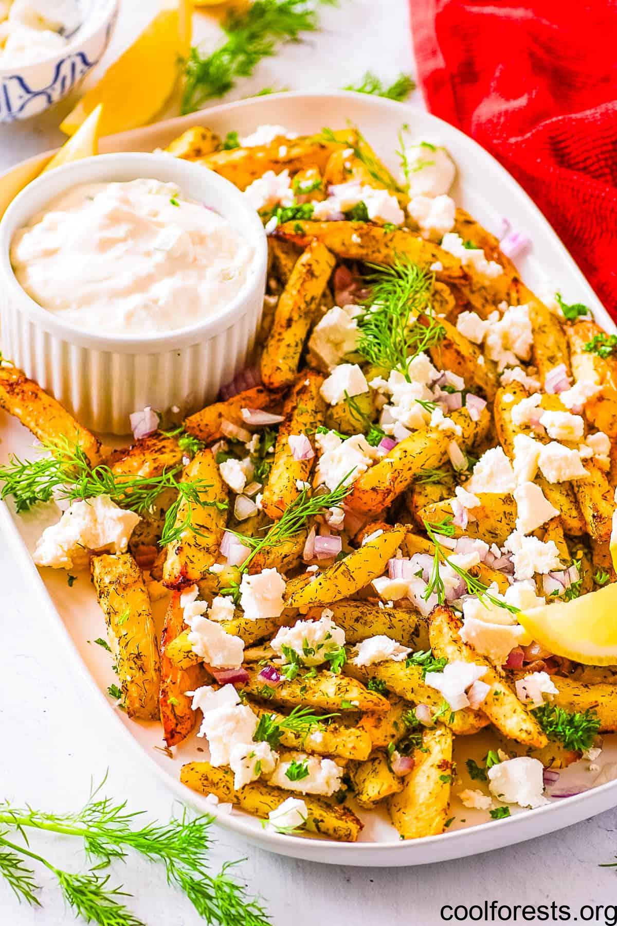Add Toppings: I transfer the cooked fries to a serving plate and top them with crumbled feta cheese, chopped parsley, diced red onion, and lemon wedges.