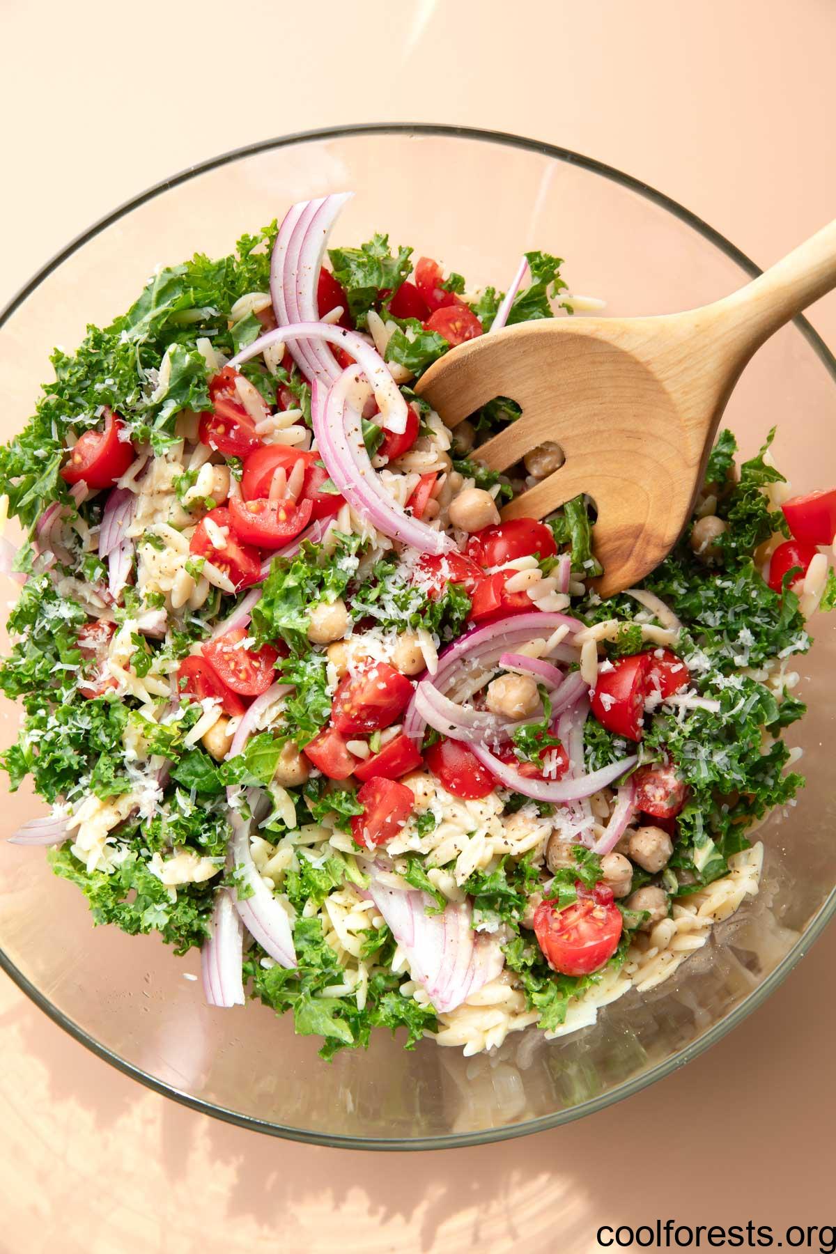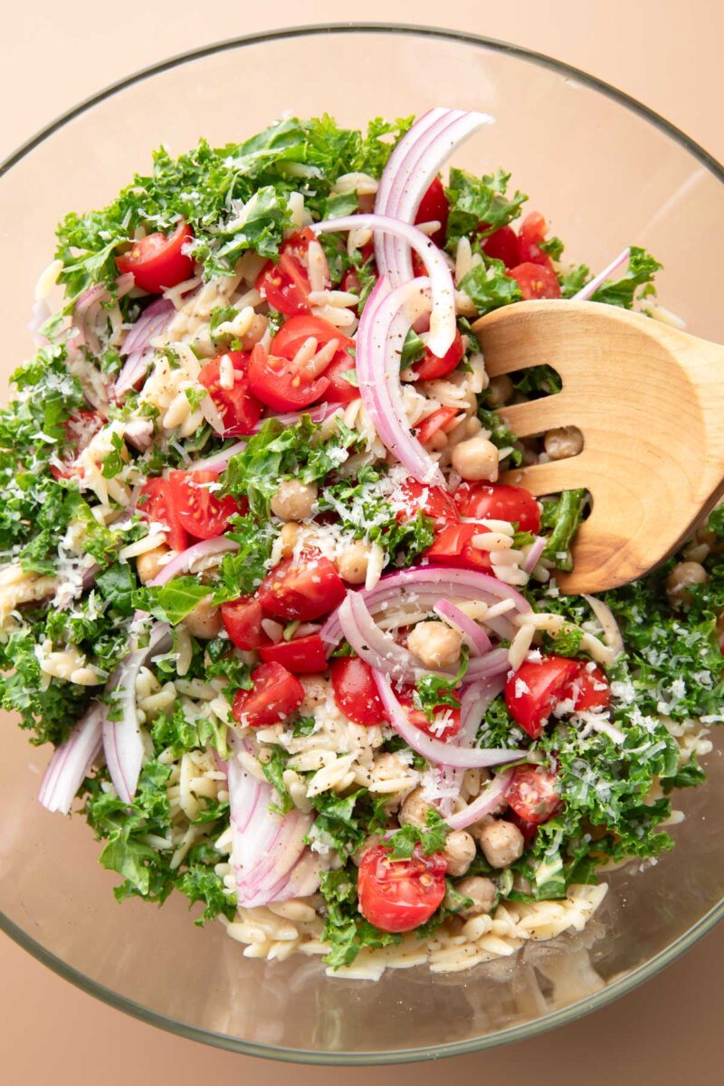 Add the cooled orzo to the salad bowl with the kale along with the chickpeas and tomatoes.