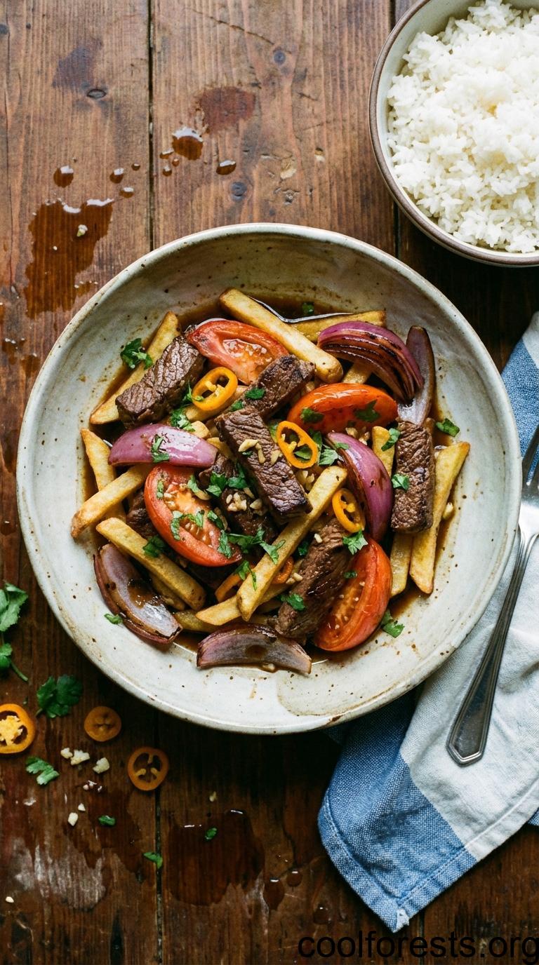 Work in small batches so the pan stays hot. The onions and tomatoes cook quickly too, just enough to soften slightly while keeping some bite. The fries get tossed in at the very end, so they absorb the sauce without turning soggy. You can use frozen fries to save time, just make sure they are crispy before they go in. Aji amarillo paste is the ingredient that gives this dish its distinctive Peruvian character. It adds fruity heat without overwhelming the other flavors. Look for it jarred or in paste form at Latin American grocery stores. Serve everything together on a big plate with white rice alongside.
