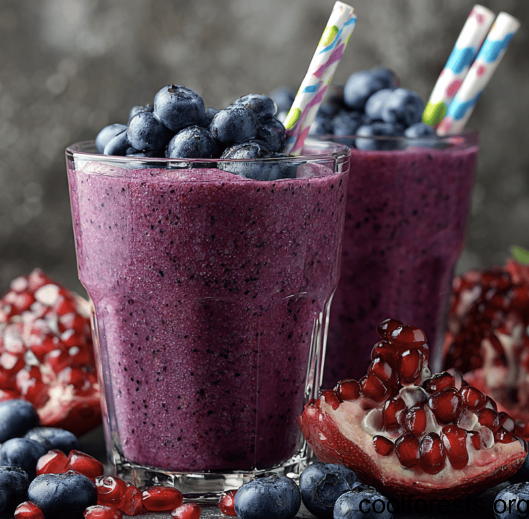 Purple smoothies in glasses with colorful straws and topped with fresh blueberries with pomegranates in the background.