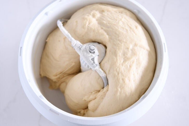 • With the mixer on medium speed, gradually add the flour until the dough clears the sides of the bowl. The dough should be soft and just slightly sticky without leaving a lot of residue on your fingers. Add additional flour only if the dough is overly sticky. Knead the dough for 2 to 3 minutes.