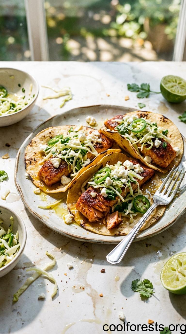 Use fresh wild-caught salmon for the best flavor. Goat cheese adds a creamy texture that complements the spicy slaw. If you prefer, substitute queso fresco for a different taste. These tacos are great for entertaining and can be prepared quickly. Store any leftover slaw in the refrigerator for up to 2 days.