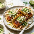 Why bake salmon for tacos instead of pan-searing it you ask? Well, because the oven does the work while you make the slaw. Salmon fillets rubbed with olive oil, chili powder, cumin, salt, and pepper, baked at 400°F (200°C) for 12-15 minutes. While the salmon bakes, shred cabbage and toss it with sliced jalapeno, cilantro, and lime juice. Warm the tortillas. Assemble with crumbled goat cheese on top.