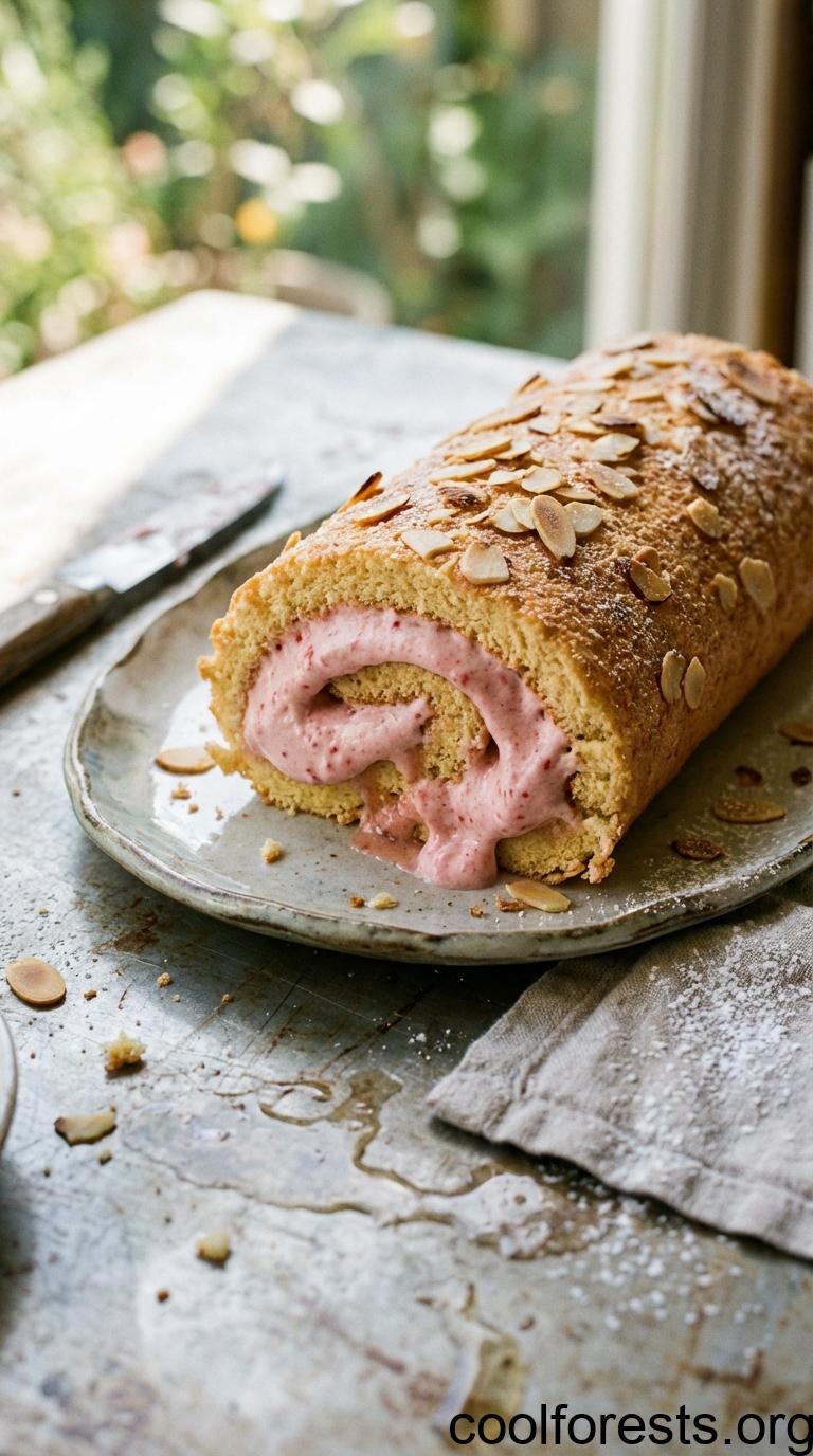 9. Roll the cake back up, sprinkle with toasted almonds, and chill before serving.