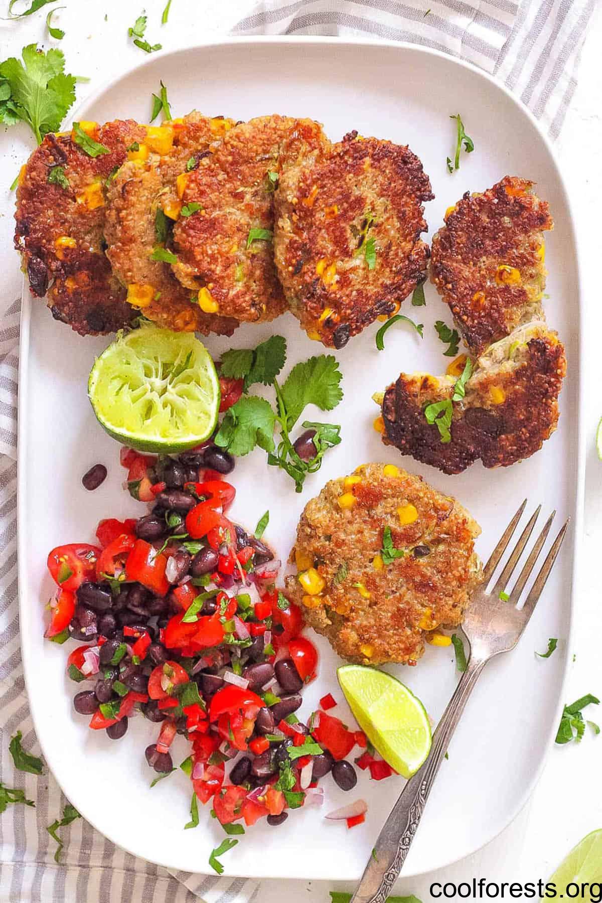Freezing: First, I lay my cakes in a single layer on a baking sheet, and freeze them for 2-3 hours until solid. Then I place them in a freezer-safe bag or container and store them for up to 3 months. The salsa is not suitable for freezing as the textures change once thawed.