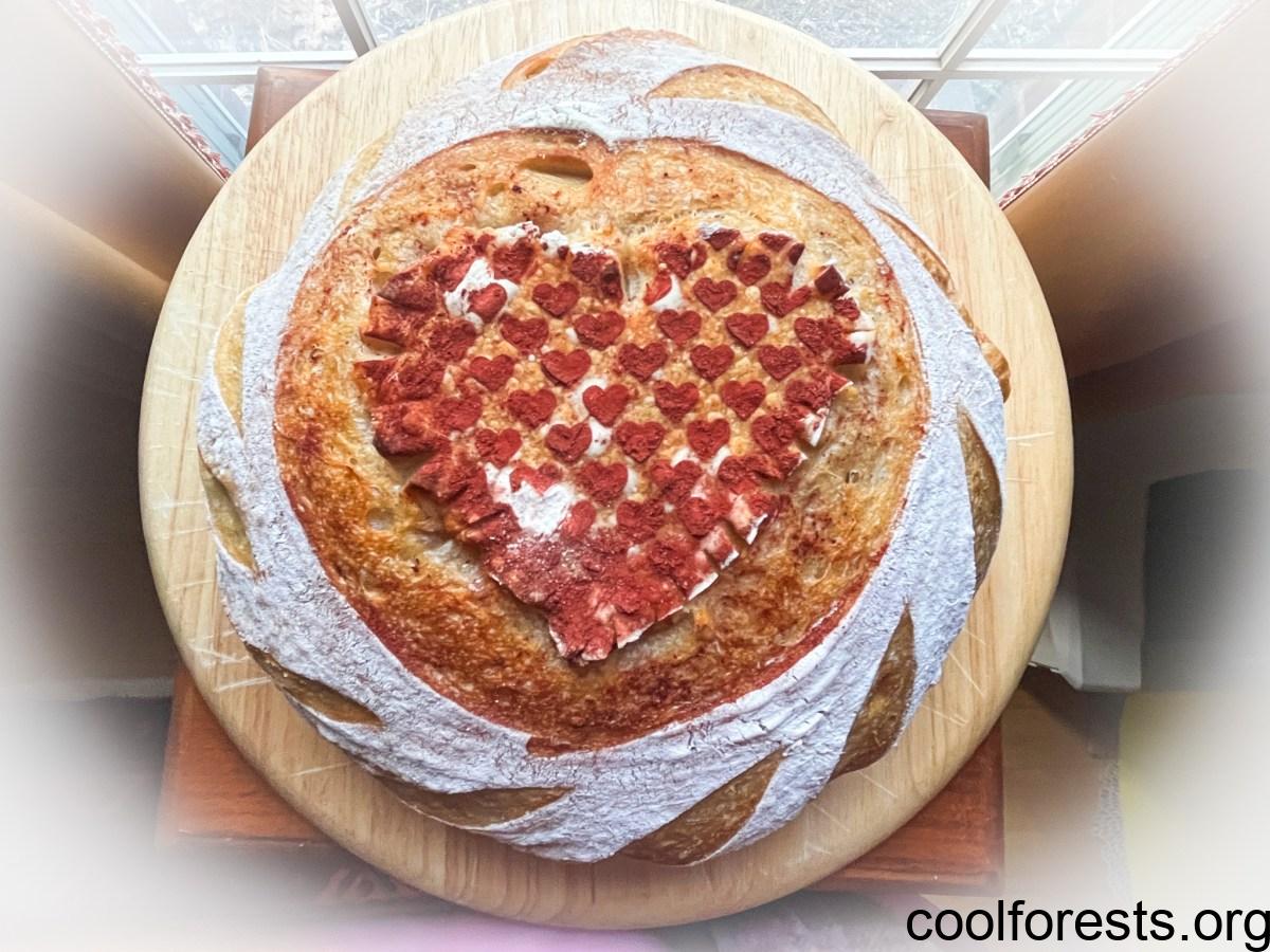 You can use any recipe you are fond of, the scoring is not intricate so you can even increase a bit the hydration level if you prefer. You will need parchment paper cut with a heart shape (save the heart and the outside area), and a stencil with little hearts. I used Red Yeast Powder to add color, but air-brushing would also work. I love how the little white heart popped into the design, totally by accident! Serendipity at work…