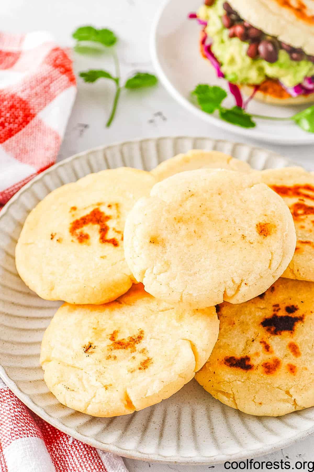 Plant based arepas on a white plate.Plant based arepas on a white plate.