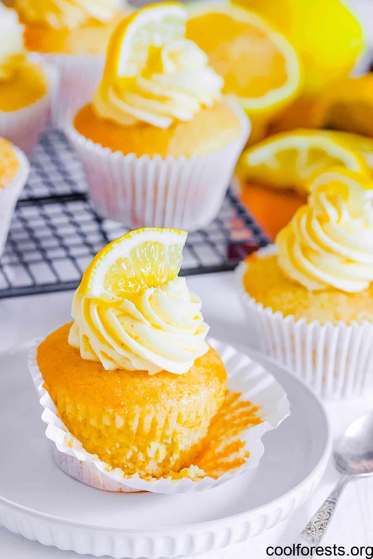 Vegan lemon cupcakes topped with vegan buttercream frosting and a lemon wedge.