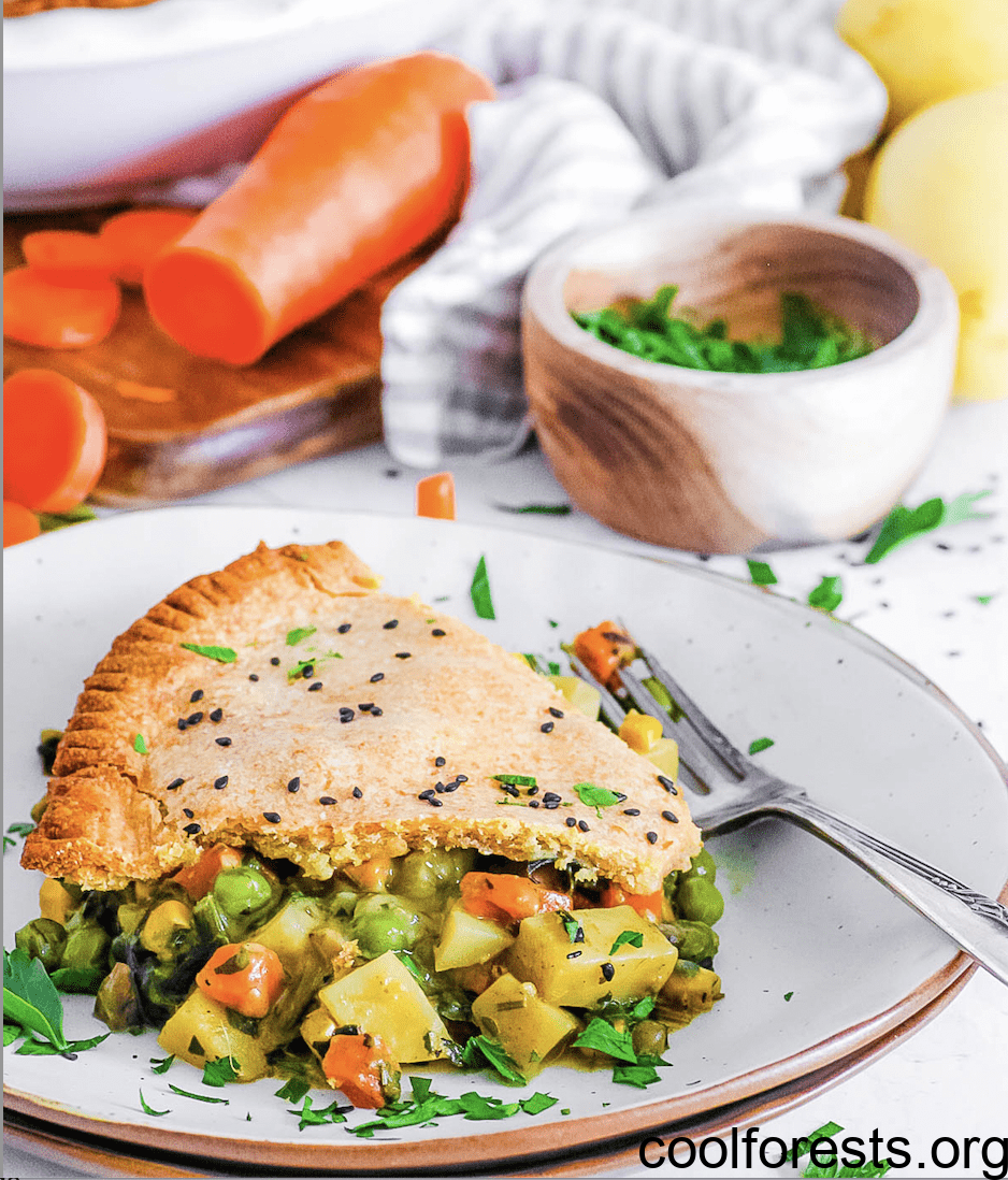 slice of vegan pot pie on a white plateslice of vegan pot pie on a white plate