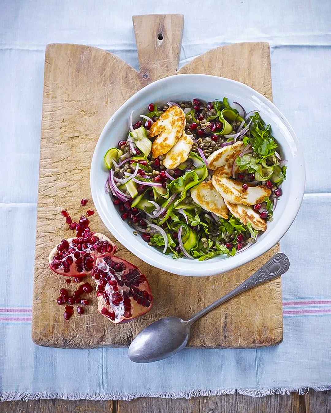 An earthy and vibrant salad featuring hearty puy lentils and salty, pan-fried halloumi cheese. Brightened with pomegranate seeds and fresh cilantro, it’s a satisfying vegetarian main.