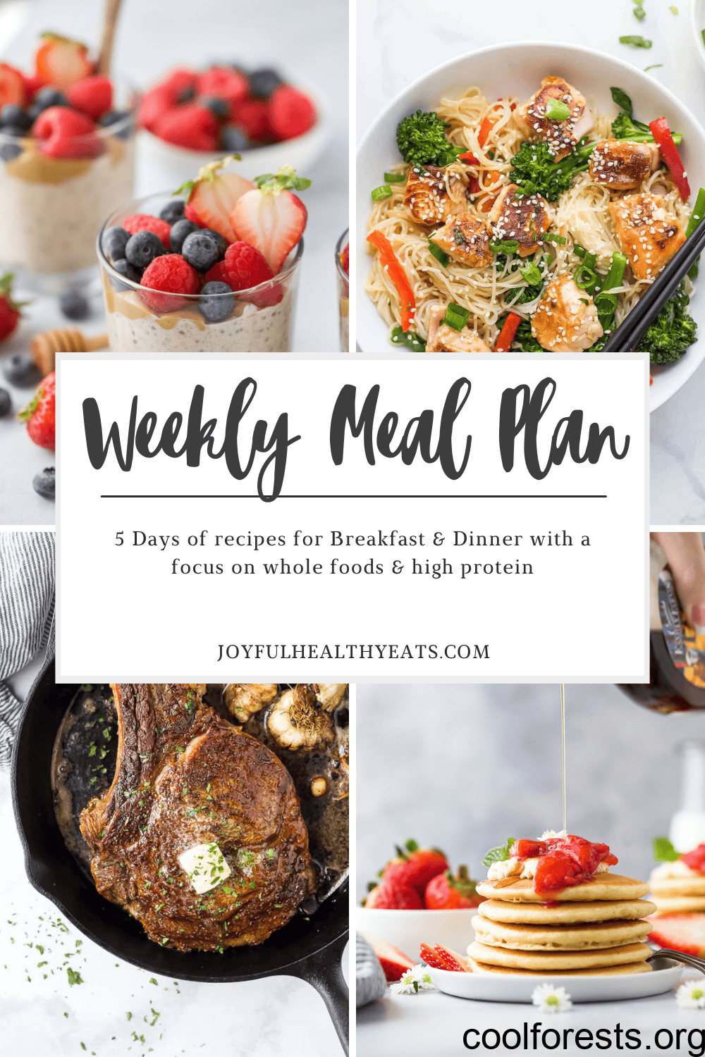 This healthy weekly meal plan has 5 days of easy breakfast and dinner recipes made from real, wholesome ingredients and a high protein focus in mind. Grab the free printable shopping list to make meal prep simple and stress-free.